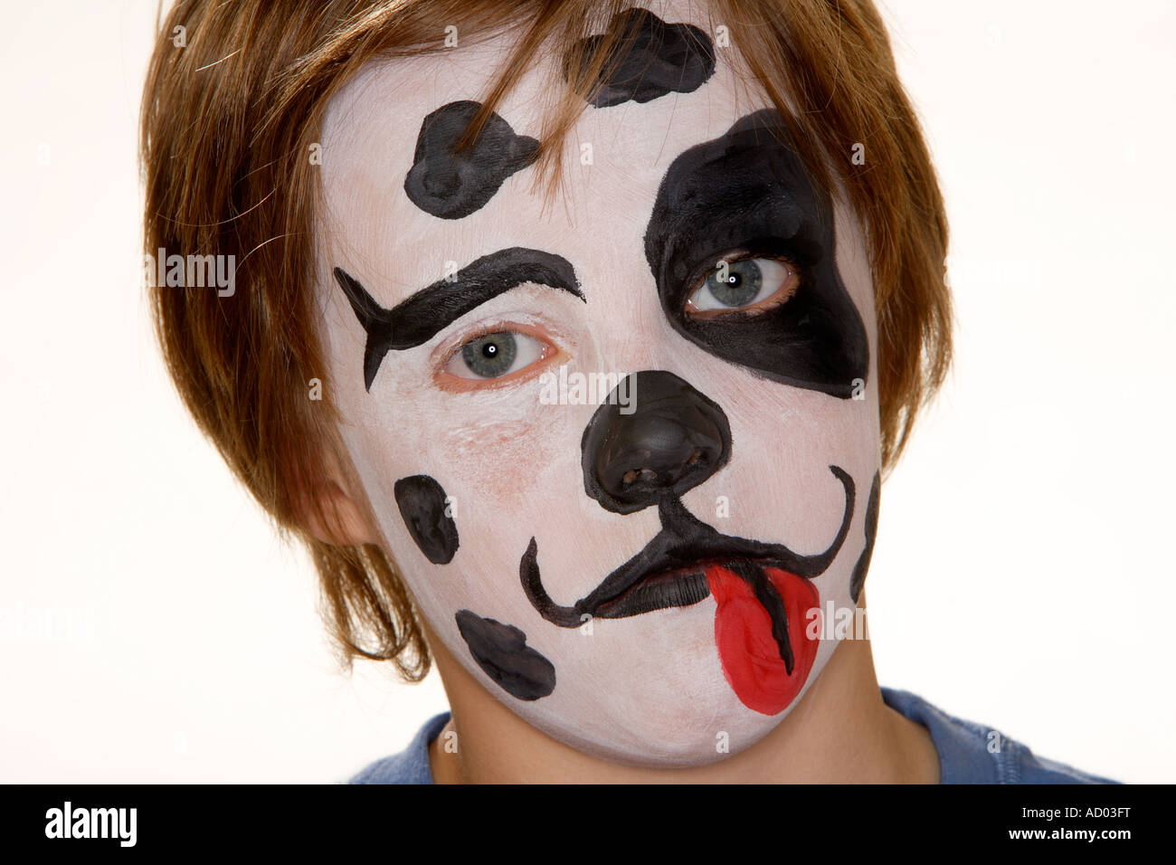 Young Boy Aged 7 8 9 10 With His Face Painted In He Design Of A Dalmatian Dog With His Tongue Hanging Out Stock Photo Alamy